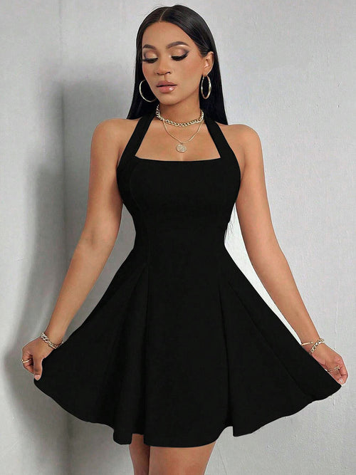 KJDESIGN Pink Halter Neck Fit & Flare Mini Dress for Women | Sleeveless Solid Party Dress with Asymmetric Hem
